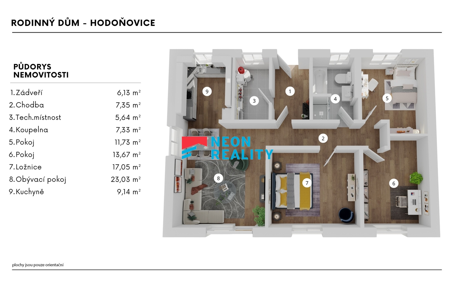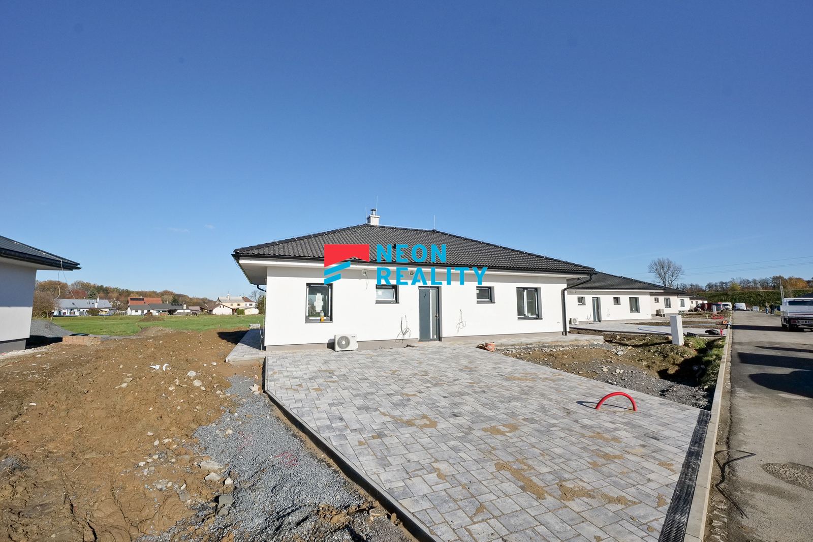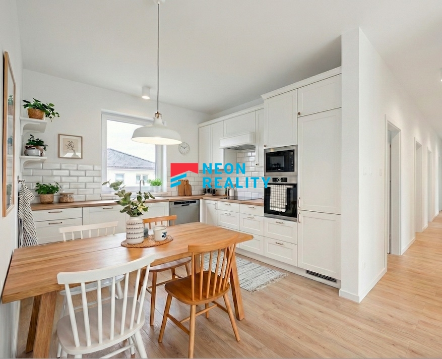 Tento dům v Baška - Hodoňovicích zaujme především svou polohou, promyšlenou dispozicí a klidným charakterem nové rezidenční čtvrti. Rozhodování o domově totiž není jen o metrech čtverečních a technických parametrech, ale především o tom, jak dům funguje v každodenním životě. A tady vše dává smysl - logicky, provozně i dlouhodobě. Nemovitost se nachází v klidné části obce, v nové rezidenční lokalitě tvořené patnácti samostatně stojícími rodinnými domy s jednotným architektonickým pojetím. Lokalita působí přehledně, bezpečně a kultivovaně, bez chaotické zástavby a vizuálních kompromisů, zároveň s dobrou dostupností do Frýdku-Místku i širšího okolí. Jedná se o samostatně stojící jednopodlažní rodinný dům (bungalov) s dispozicí 4+kk, užitnou plochou cca 101 m2 a zastavěnou plochou 126 m2. Dům je situován na rovinatém pozemku o výměře 853 m2. Objekt je nepodsklepený, se sedlovou valbovou střechou, architektonicky řešený v nadčasových proporcích, které přirozeně zapadají do okolní zástavby. Dispozičně je dům navržený velmi přehledně. Hlavní obytný prostor s kuchyňským koutem tvoří přirozené centrum domu a je orientován do zahrady s přímým vstupem na terasu. Kuchyňská linka není součástí standardního vybavení domu. Ostatní místnosti jsou ponechány bez zařízení, což umožňuje budoucímu majiteli přizpůsobit si interiér vlastním potřebám a stylu bydlení. Dům dále nabízí tři samostatné pokoje, koupelnu s vanou, samostatnou toaletu a technickou místnost. Vytápění i ohřev teplé vody zajišťuje tepelné čerpadlo vzduch-voda značky NIBE s integrovaným zásobníkem teplé vody o objemu 180 litrů. V celém domě je instalováno teplovodní podlahové vytápění, které zajišťuje vysoký uživatelský komfort a nízké provozní náklady. Součástí standardního vybavení domu je klimatizace, která zvyšuje komfort bydlení zejména v letních měsících. Dům je napojen na veškeré inženýrské sítě a nově vybudovanou technickou infrastrukturu rezidenční čtvrti. Pozemek kolem domu bude plně oplocený a umožňuje parkování dvou vozidel přímo na pozemku. Součástí exteriéru je terasa, na které si můžete vybudovat třeba bioklimatickou pergolu. Zahrada je koncipována jako klidová, s minimálními nároky na údržbu a důrazem na soukromí a relaxaci. Dům bude k dispozici od 1. 5. 2026, osobní prohlídky jsou možné již nyní. Fotografie interiéru jsou ilustrační a slouží k přiblížení budoucího standardu provedení. Nemovitost je vhodná pro klienty, kteří hledají moderní, technicky kvalitní a dlouhodobě udržitelné bydlení v klidné lokalitě s jasnou koncepcí a stabilní hodnotou do budoucna.